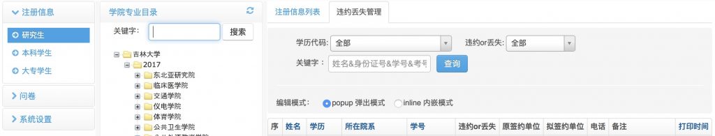毕业生管理:方便,快捷,功能强大的毕业生管理系统,做到对每个毕业生信息的精准记录,对每个毕业生做到随时的修改,添加,删除。灵活的用户权限管理,可通过用户权限细分可管理功能模块和可管理的学院, 例如可实现某学院用户只可以管理某学院数据, 某学区用户可管理某些学院数据。学院信息,专业信息的自定义维护,全国地区信息的维护,和教育部匹配的民族,政治面貌,师范生类别,学历,培养方式,困难生类别代码管理,并带有导入导出功能。方便的学生排序,可通过毕业年份,学院,专业,民族,性别,政治面貌,培养方式,是否注册等过滤筛选, 可通过表头排序,学生数据的全部或自定义导出功能,也可通过毕业生数据接口,很容易展现到就业网站上,提供给企业等准确的学生信息。